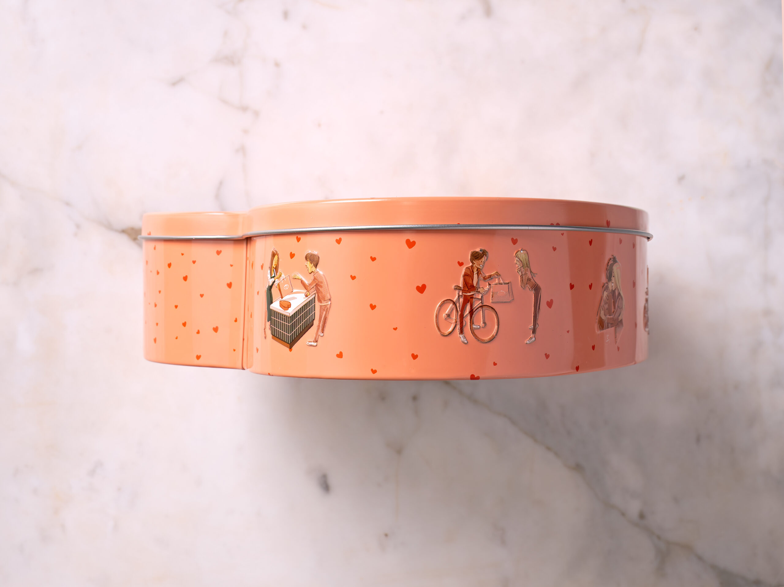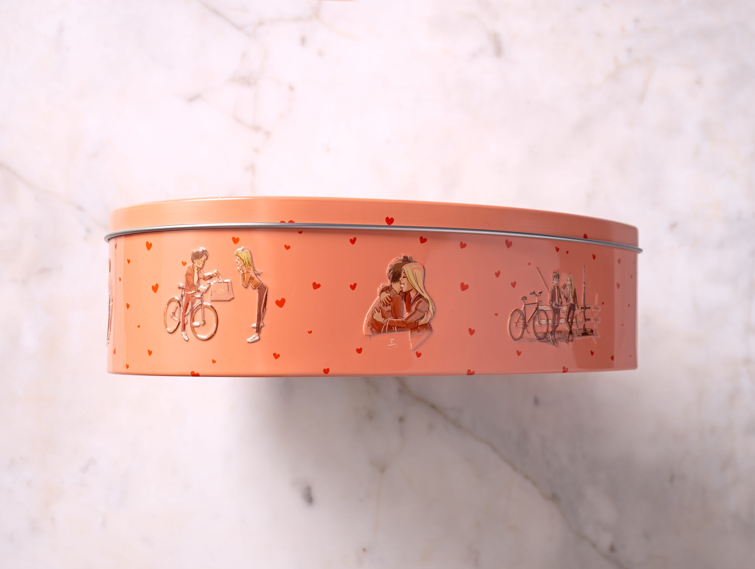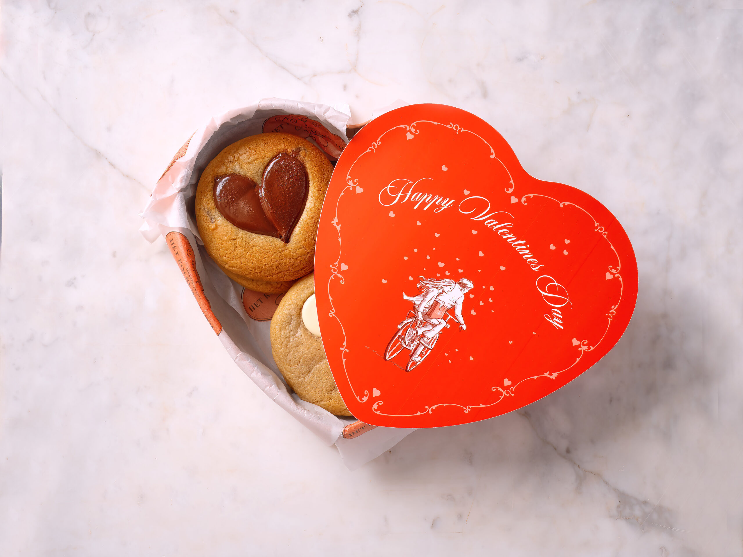 The cookie jar, with romantic illustration, is filled with 6 cookies: 1 cookie of each flavor from our current assortment. On top of the cookies comes a beautiful card in the shape of a heart, on which you can add a handwritten text. Baked with love for your loved one(s)!
